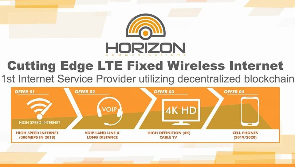 "Blockchain adalah masa depan keuangan dan data dan nirkabel adalah masa depan komunikasi" (Horizon Communications) TETAPI Horizon adalah jembatan antara komunikasi Blockchain dan Wireless untuk menghadirkan layanan internet berkecepatan tinggi di Karibia.